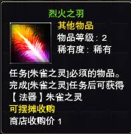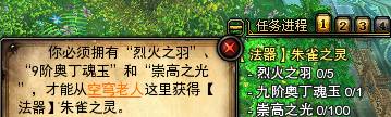 13、任务朱雀之灵:你必须拥有【烈火之羽X5】【9阶奥丁魂玉X1】和【崇高之光X100】,就可以从空穹老人这里获得神级【法器】朱雀之灵。