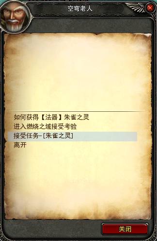 12、当从燃烧之域出来后,在与【空穹老人】对话接取任务【朱雀之灵】。