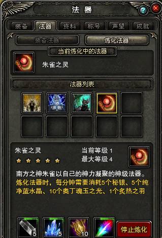 【法器】朱雀之灵炼化时,每分钟需要消耗5个秘银、5个纯净蓝水晶、10个奥丁魂玉之光、1个炙热之羽。材料分别通过采集、野外怪掉落、BOSS掉落获得。