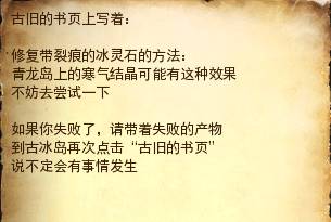 第八步:失败后,请带着失败的产物【冰灵碎片】到【古冰岛】上再次点击【古旧的书页】。