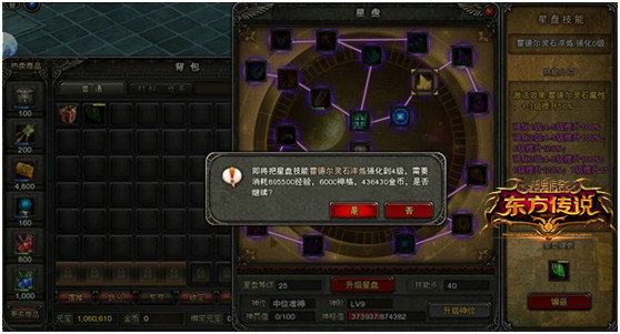 第二步:弹出强化提示框,提示使用此星石能将指定的星盘技能强化到多少级,需要多少花费。如不能满足强化条件则无法进行星盘技能强化。