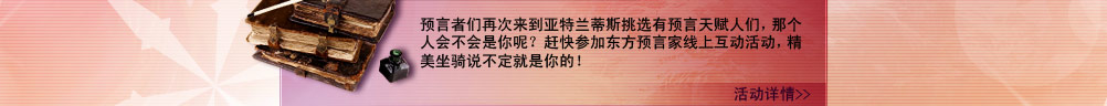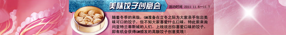 活动介绍:活动开启后,请玩家在6线亚特兰蒂斯贸易广场摆摊,名称为你喜爱或者希望的饺子口味。如:“香草奶油饺子”等,GM将随机挑选玩家进行高额奖励。