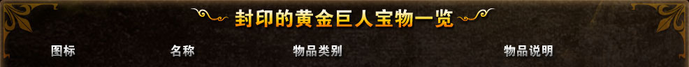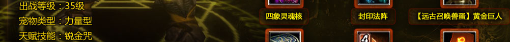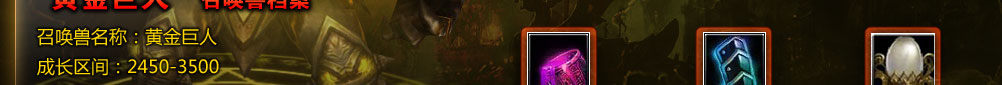 | 【远古召唤兽蛋】黄金巨人 | 召唤兽 | 封印了远古召唤兽的蛋,点击使用后将会获得远古召唤兽——黄金巨人。天赋技能:锐金咒,使周围10格内的12个友方目标在15秒内命中率提高30%,物理、魔法防御提高10%。 |