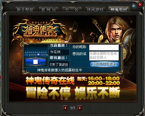 第二步:在弹出的窗口中,点击激活“神鬼电台”这一选项卡后就能收听到电台节目。该窗口保持激活“神鬼电台”选项卡的同时,点击窗口右上角的最小化按钮可以将此窗口缩小为图标状态进行显示,这样就能能收听和游戏两不误了。