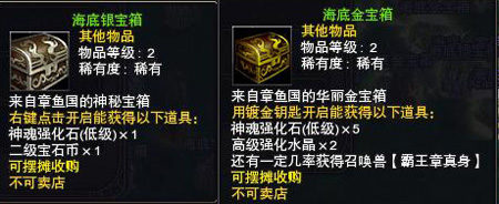3、 所有玩家都可以采集这些洒落出来的宝箱,采集后获得对应的“海底金宝箱”或“海底银宝箱”道具。宝箱开启后将直接获得对应奖励,开启海底金宝箱还有机会免费获得5星力量召唤兽——霸王章真身。