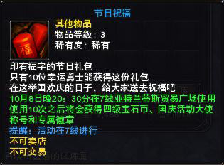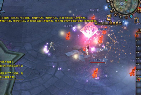 3、 每次使用“节日祝福”会通告全服,且在使用者周围出现许多“国庆礼炮”,所有玩家都可以采集这些礼炮来获取“国庆礼包”。
