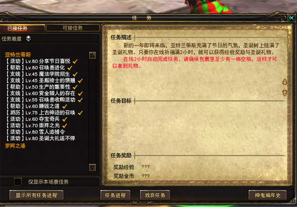 活动形式:活动期间,您可与亚特兰蒂斯-圣诞树对话,领取节日任务,在线满2小时即可自动完成。(此任务每日只可接取一次)。