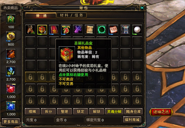 第三步:右键打开圣诞礼品盒,有机会免费获得圣诞时装、圣诞耳包图样、圣诞帽图样、【背饰】冰晶雪凝、试炼之石、装备强化水晶和准神神髓等丰厚奖励。