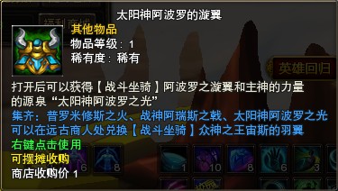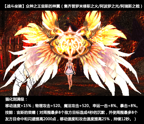 太阳神阿波罗的漩翼 | 内含阿波罗之光和阿波罗之漩翼,阿波罗之光是合成【宙斯羽翼】的必备道具。【战斗坐骑】阿波罗之漩翼,强化到满级效果:移动速度+10% 四系元素攻+120 幸运一击+6%,特殊技能:元素之怒(8秒内所有元素攻击提高60%,命中提高500点,暴击提高10%)。 |