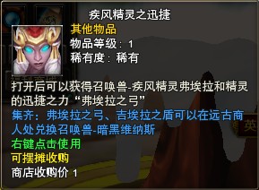 疾风精灵之迅捷 | 打开后可获得召唤兽-疾风精灵和弗埃拉之弓,疾风精灵——50级可召唤,1800-3000成长,力量型,技能:疾风之力(被动提升召唤兽15%的物理攻击力)、疾风箭矢(对目标造成2.5倍物理攻击力的伤害,并割裂目标双足减速35%),弗埃拉之弓和吉埃拉之盾可以在远古商人处兑换召唤兽-暗黑维纳斯。 |