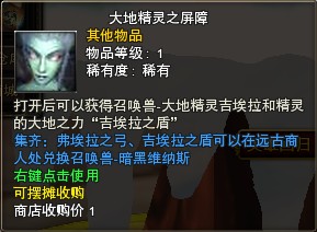 大地精灵之屏障 | 打开后可获得召唤兽-大地精灵和吉埃拉之盾,大地精灵——50级可召唤,1800-3000成长,智力型,技能:元素之力(提升召唤兽自身15%的魔法攻击力)、元素法刃(对目标造成2.5倍魔法攻击力的伤害,并沉默目标持续2.5秒),弗埃拉之弓和吉埃拉之盾可以在远古商人处兑换召唤兽-暗黑维纳斯。 |