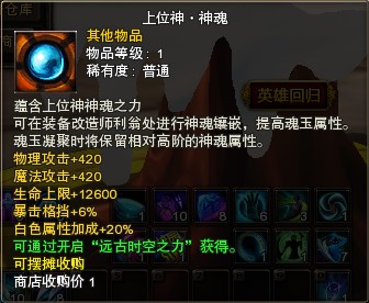 上位神-神魂 | 蕴含上位神神魂之力,用于提高魂玉属性的道具,魂玉凝聚时将保留相对高阶的神魂属性。(上位神·神魂属性:物理攻击+420、魔法攻击+420、生命上限+12600、暴击格挡+6%、白色属性加成+20%) |