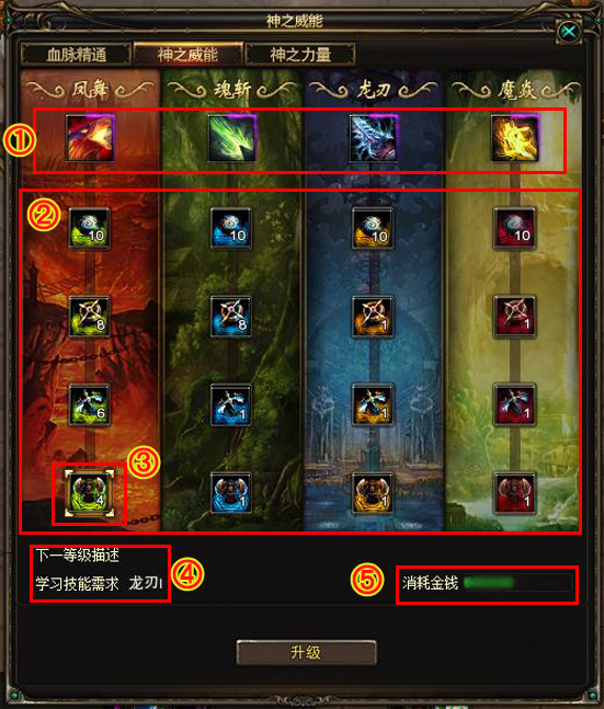 ② :装备神威装备可获得的技能以及升级的技能等级;