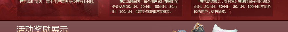 累计在线时间100小时:iPhone4S(一名)、克鲁尔手办(三名)、4级钝厚(五名)、希莉娅等身抱枕(10名)、500元完美一卡通(20名)