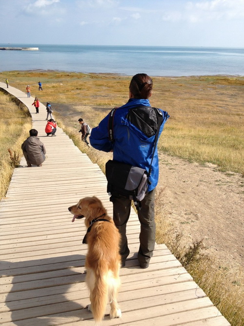 我和“佐罗”在青海湖边散步,不错的背影吧,“佐罗”也很喜欢青海湖,它喜欢这里温柔的阳光。
