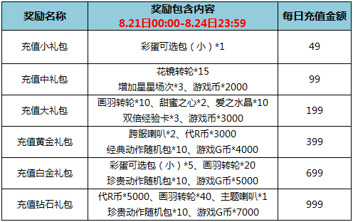 1.活动期间,在8月21日00:00-8月24日23:59,玩家每日充值一定金额,即可免费领取所对应的充值奖励礼包,奖励每日只能领取一次,充值金额按天计算;