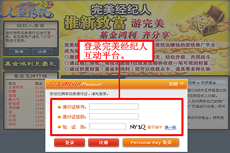 2、点击“登录”按钮,输入完美通行证账号、密码及验证码进行登录(注册完美通行证,看这里)