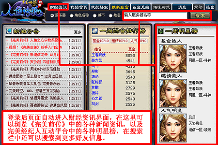 3、 登录后页面自动进入财经资讯页面,在这里可以浏览《完美前传》中的各种新闻资讯,以及完美经纪人互动平台中的各种明星榜,在搜索栏中还可以搜索到更多好友信息。(如何查找更多好友,看这里)