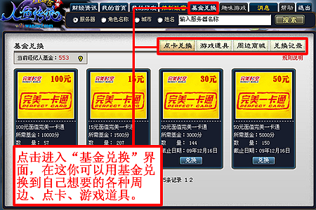 7、点击进入“基金兑换”页面,在这你可以用基金兑换到自己想要的各种周边、点卡、游戏道具。