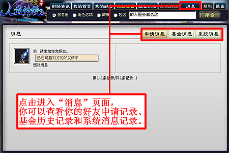 8、点击进入“消息”页面,你可以查看你的好友申请记录、基金历史记录和系统消息记录。