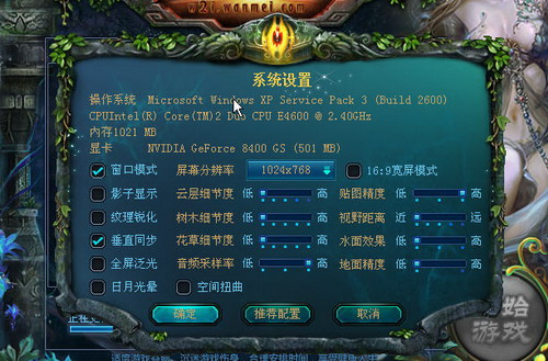 4、游戏更新完毕请您先选择系统设置,游戏会根据您的机器配置推荐给您一个已经设定好的系统设置,不过您也可以根据自己的需要进行调节。