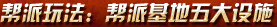 帮派基地一共有五类设施,包括麒麟厅·聚义、朱雀宿·天元宝号、青龙宿·兵械库、白虎宿·炼丹房、玄武宿·破魔堂。建造设施需要帮主携带足够的虚拟币,同时帮内材料量、星蕴点数达到要求,才能在管理界面中执行建造操作。建造设施需要一定时间,可以通过花费更多的材料提高建造速度,帮派设施升级后可以提供更多的功能与服务。