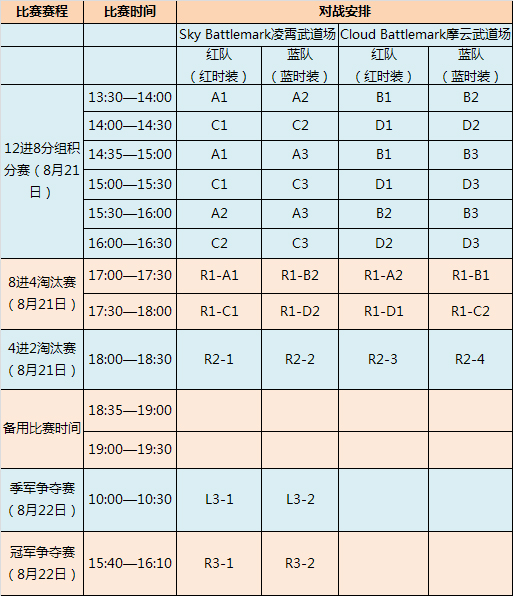 3、时装:玩家可在邮筒处领取红、蓝比赛时装各一套,比赛时装不得染色。比赛时双方战队须根据赛程安排表身穿指定颜色的时装,红队身穿红时装,蓝队身穿蓝时装,比赛途中不得更换时装,否则将取消该队比赛资格。