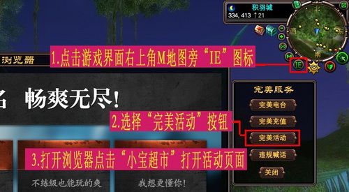 登录游戏后方可参与本活动,参与活动只需点击游戏界面右上角M地图旁"IE"图标按钮,再点击"完美活动"按钮,打开游戏内浏览器点击"小宝超市"进入活动页面。