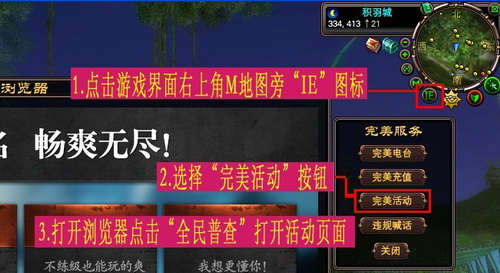 登录游戏后方可参与本活动,参与活动只需点击游戏界面右上角M地图旁"IE"图标按钮,再点击"完美活动"按钮,打开游戏内浏览器点击"全民普查"进入活动页面参与活动。
