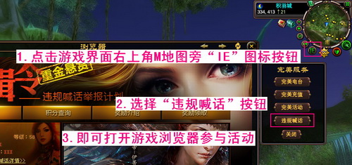 使用积分请点击游戏界面右上角M地图旁"IE"图标按钮,再点击"违规喊话"按钮即可打开活动页面参与本活动。