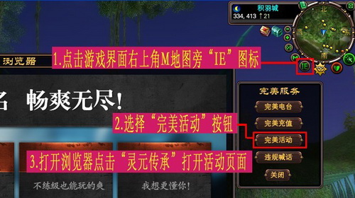 登录游戏后方可参与本活动,参与活动只需点击游戏界面右上角M地图旁“IE”图标按钮,再点击“完美活动”按钮,打开游戏内浏览器点击“灵元传承”进入活动页面。