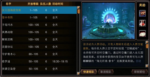 每日在人界上空不定时刷出空贼威布的飞艇,通过击杀它进入海底宝库寻找宝物。获得的宝物可以用于和麒麟镇的海元巨商 索卡兑换更高级的奖励。