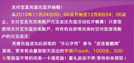 活动期间,每天凡通过支付宝在完美时空官网对完美账户一次性充值60元(含60元)以上的前650名玩家,除可参与“连连看翻牌 ”游戏外,均可在2个工作日内获得完美时空返还的6个元宝;