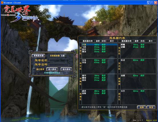 1.进入游戏您需要先选择一个所在服务器,点击登录对话框左上角的“更换服务器”就可以显示全部服务器列表,如下图所示: