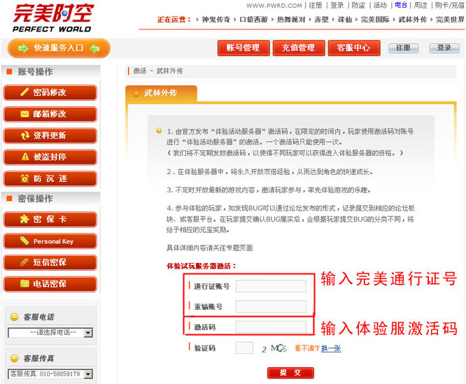 一、 领取体验服激活码后,登录完美时空通行证激活武林体验服务器页面:http://passport.wanmei.com/jsp/wulinjihuo.html