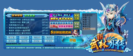 步骤一:双击桌面“武林外传”游戏图标,进入登录页面。点击【开始】按钮进入服务器选项界面。