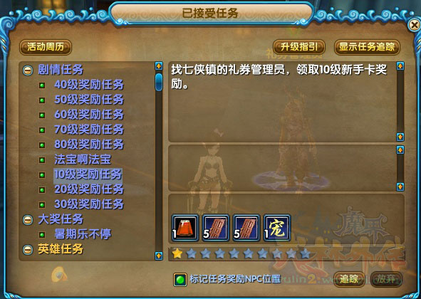 | 30级 | 九福大补丸 | 高级新手传送符*5 | 专用传送符*5 | 仙豆*10 | 妙笔生花*5 | 陨星指环、陨星项链*1 | 30级新手暴伤武器(各职业) | |