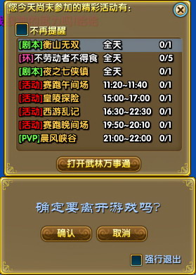 同样,在玩家点击“退出游戏”按钮时,也会弹出相同的活动面板,提醒您以免漏下了哪些精彩的活动。