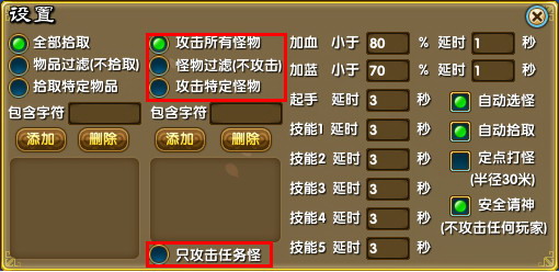 3、同时挂机时还可选择“只攻击任务怪”。这样玩家在挂机时可选择只打哪一种或者几种怪物,大大提高完成任务的效率。