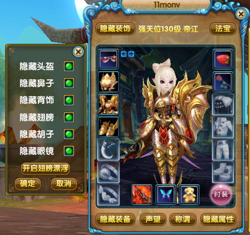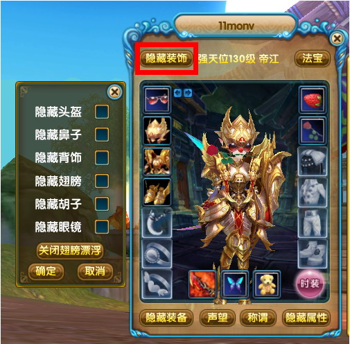 点击人物面板左上角的“隐藏装饰”按钮后,弹出“隐藏装饰”界面,可以复选如下选项:头盔、鼻子、背饰、翅膀、胡子、眼镜,以及‘关闭/开启翅膀漂浮’按钮。玩家可打造个性化外形。