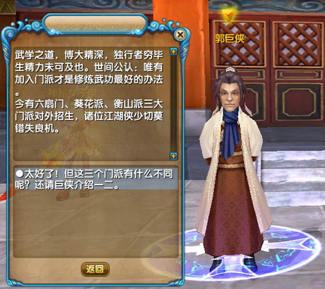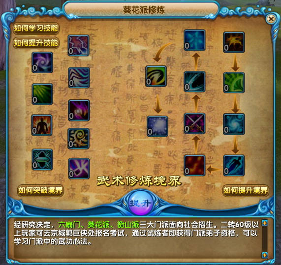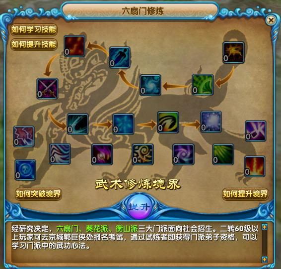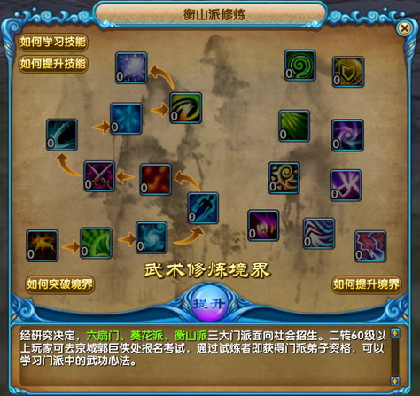 经研究决定,六扇门、葵花派、衡山派三大门派面向社会招生。二转60级以上玩家可去京城郭巨侠处报名考试,通过试炼者即获得门派弟子资格,可以学习门派中的武功心法。