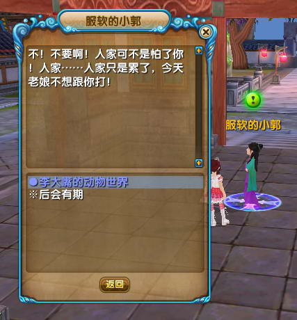 十四、龟兔赛跑完成后,挑战同福客栈门口的佟湘玉,这是最后一步了哦,很好打的,打败佟湘玉后,闯关就完成了。