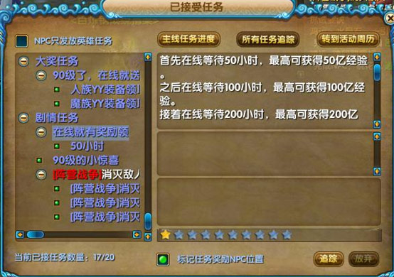 活动开启后,大侠们只要进入游戏,保持在线时间分别达到50小时,100小时,200小时和400小时,就能获得各种各样的奖励啦!最高送200亿,并且免费赠送十三阶天成符、+11背包必成符、+16法宝必成符。奖励绝对给力,保送大侠飞速升级!
