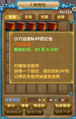 玩家在线就有机会获得小六巡夜随意门红包、小六巡夜游乐场金币红包、小六巡夜大红药红包、小六巡夜BUFF药红包,还有高级传送符,游乐场金币,无暇的太阳神,猛烈攻击药剂(2小时),所有奖励均不绑定,可以交易给其他玩家哦!