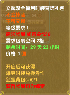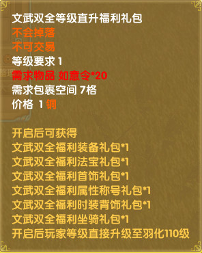 礼包开启后,大侠将秒速直升至羽化110级(即310级)!不仅如此,还能瞬间获得“文武双全福利装备礼包”,内含多种多样的装备甚至武器兑换券。