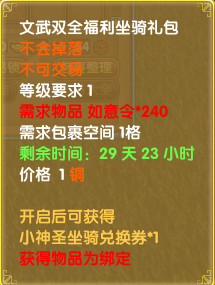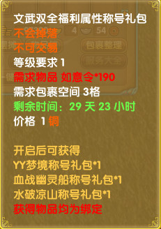 除此之外,开启“文武双全福利礼包”还将收到按需开取的“文武双全福利法宝礼包”、“文武双全福利首饰礼包”、“文武双全福利属性称号礼包”、“文武双全福利时装背饰礼包”以及“文武双全福利坐骑礼包”等五重大礼!
