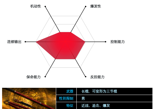 主要以长棍旋转出的圆盾进行防御,同时可以格挡或反制多个敌人的攻击。