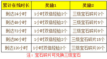 活动期间玩家累计在线时长超过一定时长,即可获取相应的宝石碎片礼包一份,当然越久越多喔!