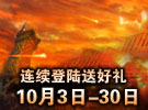 10月3日-10月9日、10月10日-10月16日期间,玩家大于或等于30级的角色,连续3天登陆游戏奖励:冰幻法衣时装(3天时限)小喇叭礼包(绑定)招财进宝(绑定)两仪水晶(绑定)等超多奖励,连续7天登陆游戏奖励中级九花雨露(绑定)。