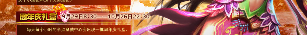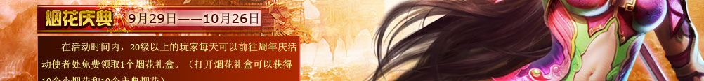 活动时间:9月29日——10月26日 活动内容:在活动时间内,20级以上的玩家每天可以前往周年庆活动使者处免费领取1个烟花礼盒。(打开烟花礼盒可以获得10个小烟花和10个庆典烟花)。 小烟花:每天最多可以燃放10次,燃放后可以获得经验以及一个随机的增益状态。 每天最多可以燃放10次,在皇城中心燃放,可以获得大量经验,附近玩家也将可以获得经验。